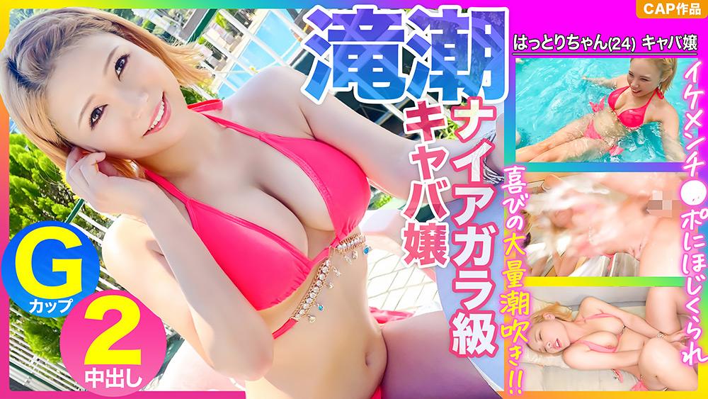 商品紹介文: 水着ギャルをゲットするため東京の端にあるプール施設まで車を飛ばす!目当てのアトラクションに乗れずにご機嫌ナナメの水着ギャル2人組に遭遇。キャバクラで働く先輩後輩コンビ。お金が大好きみたいでギャラ飲み交渉を持ちかけるとあっさり承諾→夜に部屋に呼び出す→和みながらどんどん飲ます→水着に着替えてもう。イケメンナンパ師にメロメロの先輩【はっとりちゃん(24)】。ソファでイチャイチャ→キス→Gカップパイ揉み→愛撫→手マン→クンニ→フェラ→ギンギンチンポを見て「これ絶対気持ち良い…欲しくなっちゃった…」とおねだり→ヌルヌルになったマンコに挿入!奥まで押し込むと「ヤバいヤバい…!」と息が荒くなる。正常位→背面座位(絶頂潮吹き)→立ちバック(ハメ潮)→騎乗位→バックで中出しww一回じゃ収まらずもう一度挿入、中はダメと言われるが気持ち良さそうにしてたので再度中出し!!「中はダメって言ったのに~w」怒られたけどチンポをサワサワwもう一回挿れて欲しいみたいでしたww